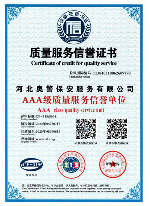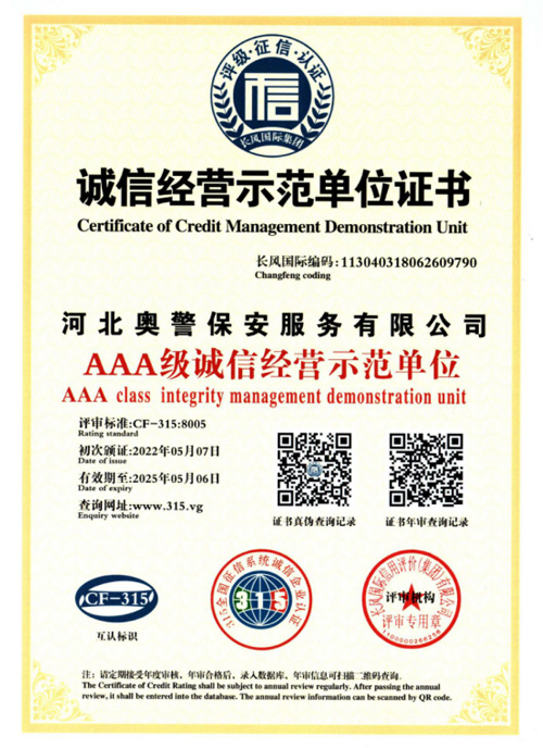 奧警邯鄲保安公司是一家民營(yíng)保安服務(wù)公司,工商行政管理局登記注冊(cè),獲取相關(guān)等級(jí)資質(zhì)證書,是一家大型的保安連鎖服務(wù)公司。